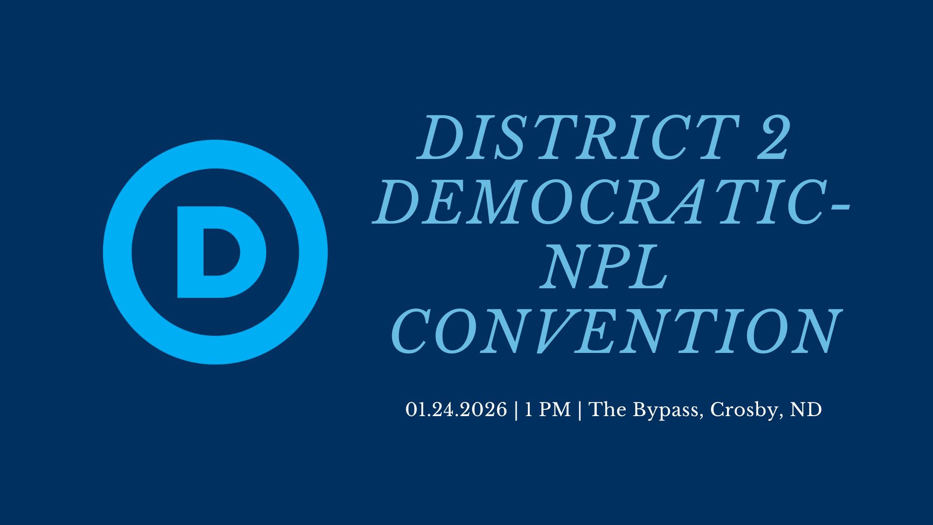 Join us on January 25 to approve State Convention delegates and to adopt our 2026 district platform. Meetings and membership are open to any person who supports Democratic-NPL ideals or who affiliates themselves with Democratic- NPL values. With Special Guest Speaker Bob Valeu – Former State Dem-NPL Chair